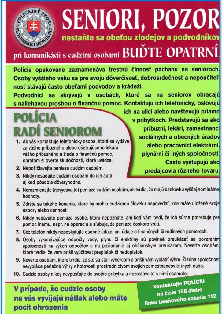 Dávame do vašej pozornosti oznam, ktorý sme dostali z Krajského riaditeľstva Policajného zboru v Žiline a ktorý sa týka spolupráce pri informovaní seniorov z dôvodu narastajúceho počtu pokusov podvodov v celom Žilinskom kraji.